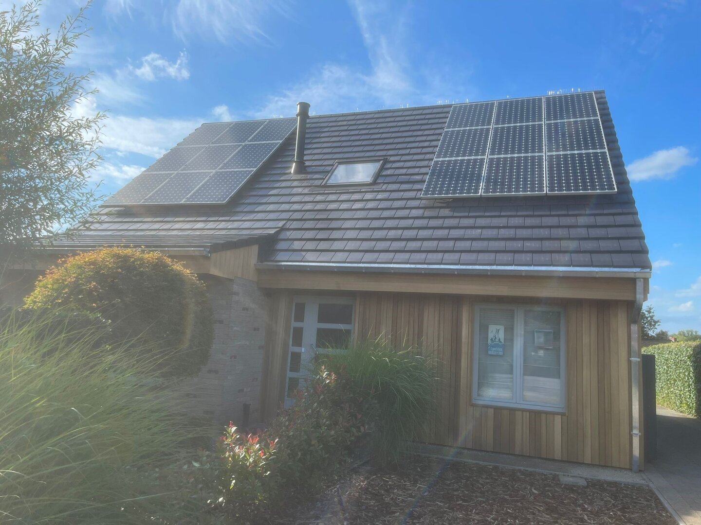 Deze woning kreeg een nieuw dak. Voor aanvang van de dakwerken (door andere aannemer) haalde Klimatisatie Heirbaut de bestaande zonnepanelen en onderstructuur van het dak en stockeerde het materiaal onder de carport nabij de woning. Na voltooiing van de nieuwe dakbedekking kwamen we terug voor de hermontage van de onderstructuur en zonnepanelen op de vlakke tegelpannen alsook voor de veilige heropstart van de PV-installatie.